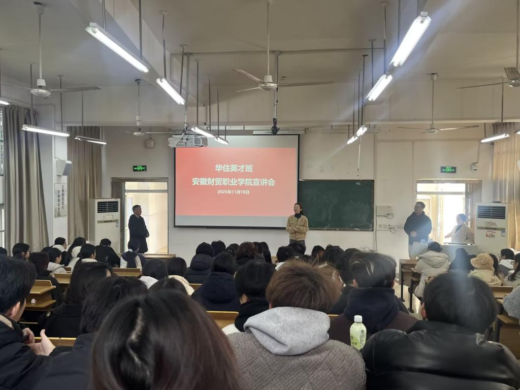 11月19日下午,文化创意学院联合华住集团,在蜀山校区举办“华住英才班”专场宣讲会。华住集团校企合作副经理陈雯、文化创意学院副院长江友农、教研室主任朱大伟、王丽、宋亚楠、相关班级辅导员,以及茶艺与茶文化、旅游管理、酒店管理与数字化运营三个专业共计200多名学生参加了宣讲会。