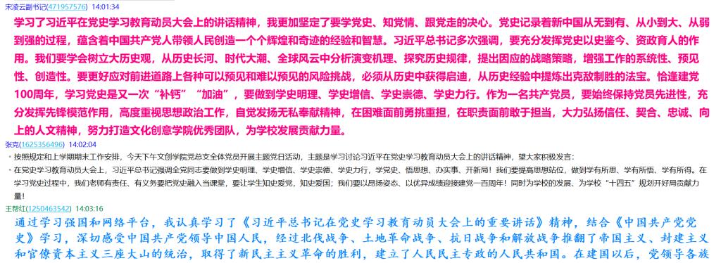 此次线上学习交流研讨活动,是文化创意学院党员教师们假期的一次精神上“大餐”,也是开学前党员教师的及时“收心”活动。通过回望中国共产党走过的峥嵘岁月,我们更加珍惜眼下来之不易的生活和工作,更加坚定“为中国人民谋幸福、为中华民族谋复兴”初心和使命,从而以更加昂扬的斗志投入到学院的教育事业中去。