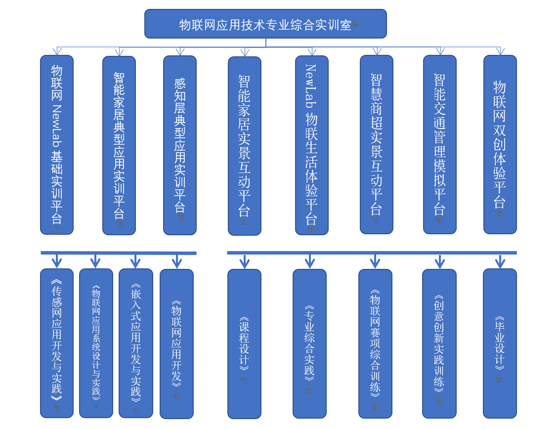 物联网应用技术专业综合实训室立足现代信息化技术,紧跟国内外物联网、大数据、云计算相关领域的前沿技术,按照高标准、重实用、可发展的要求,构建了物联网基础实验环境、课程实训环境、技能大赛模拟环境、科研创新开发环境、1+X等级证书培训考试环境、应用创新开发环境、虚拟云计算环境、创新创客实训环境等,为促进物联网专业人才的培养、人才与产业链的无缝接轨提供支撑。