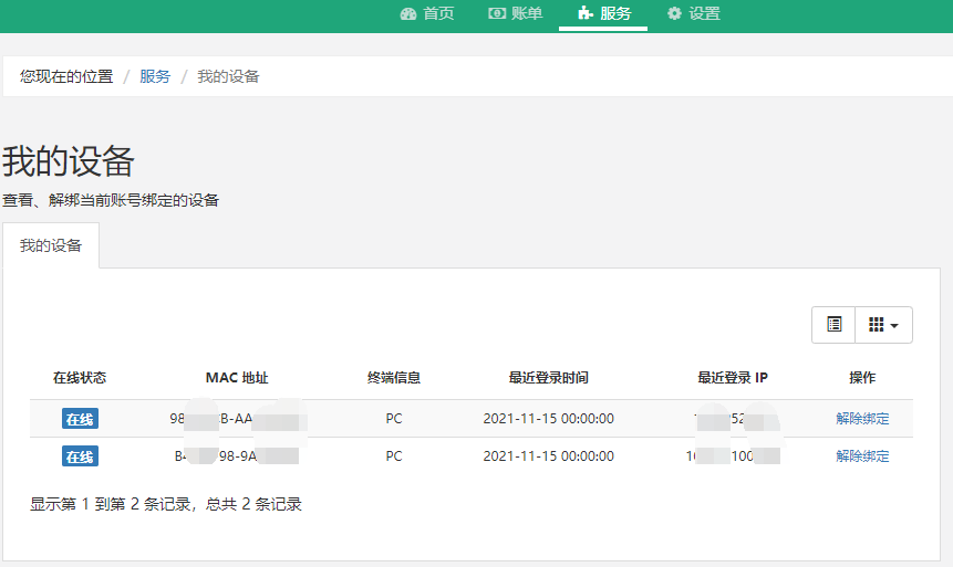 我的设备:可以查询账户无感知绑定的设备,可以解除其绑定。
