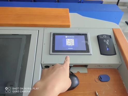 (点击讲台右上角平板,点亮平板屏幕,显示开机二维码)