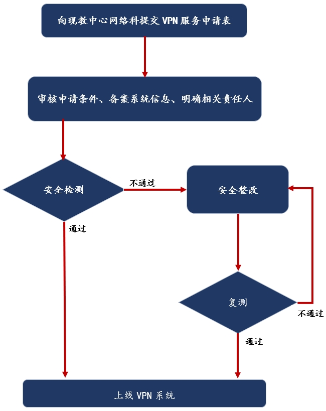 2.现教中心审核并进行安全检测,通过后上线至VPN系统;不通过则根据检测报告整改安全项,复测通过后上线。