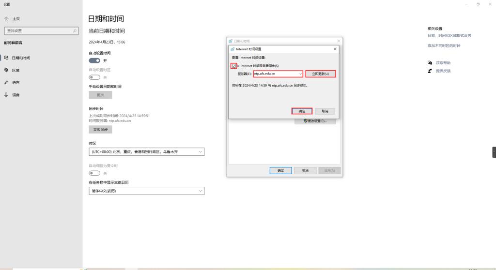 在Internet时间设置对话框中勾选“与Internet时间服务器同步”;在服务器后输入ntp.afc.edu.cn,点击立即更新与确定退出即可。如图4所示。