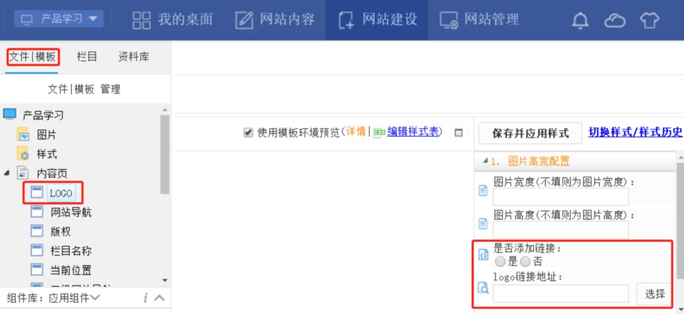 在网站建设文件一文件|模板中找到对应的logo内容组件一右侧样式中选择需要添加的链接即可,如图1所示。