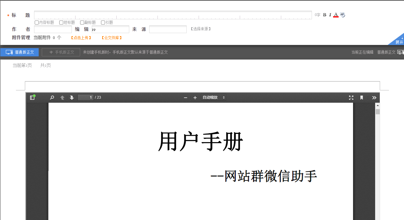 步骤一:打开文章编辑器后,点击pdf导入按键,如图1;