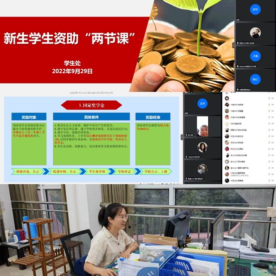 为进一步做好学生资助政策宣传工作,落实省教育厅关于开展学生资助政策宣讲“两节课”主题活动的要求, 9月29日晚,学生处举办2022级新生学生资助“两节课”主题宣传活动,活动通过腾讯会议直播形式进行,新生各班班长和资助委员参加,宣讲会由学生资助中心资助管理干事蔡玉菊主讲。