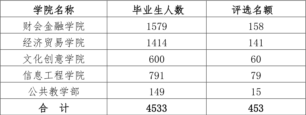 学院优秀毕业生按照毕业生人数的10%比例评选,2021年毕业生人数4533人,评选名额为453名。具体名额分配如下: