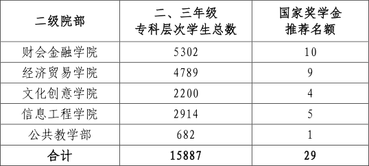 2.国家奖学金奖励标准为每人每年8000元。各二级院部根据学院分配的推荐名额上报候选人,由学院国家奖助学金评审委员会进行评审,提出评审意见,报学院学生资助工作领导组研究。