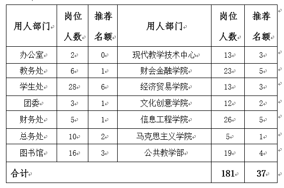 按照全院学生参加勤工助学固定岗位人数的20%比例,四舍五入,各用人部门推荐勤工助学先进个人共37人。推荐名额分配如下: