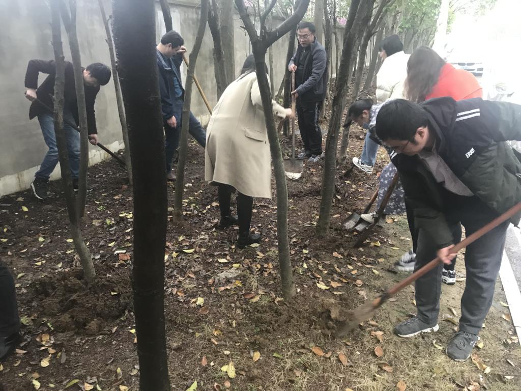 护绿劳动现场,大家分工明确,相互配合,齐心协力给树木松土、除杂草,以实际行动美化校园环境,全场呈现出一派热火朝天,欢声笑语的劳动场面,大家其乐融融,干劲十足,圆满完成任务。