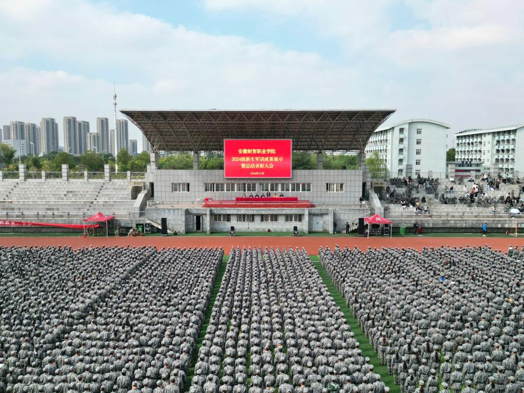 10月25日上午,学校在田径场举行2024级新生军训成果展示暨总结表彰大会,省供销社党组成员、理事会副主任魏邦余,学校领导张志祥、何翔、罗虹、王海龙、承训单位肥西县人民武装部、2024级新生军训工作领导小组成员及全体新生班级辅导员参加大会。