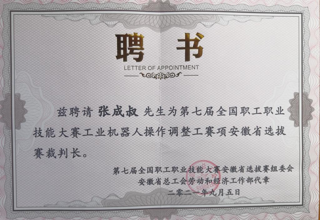 2021年9月16-18日,第七届全国职工职业技能大赛—工业机器人操作调整工安徽省选拔赛在省会合肥举行,我校信息工程学院院长张成叔受邀担任本次大赛的裁判长。