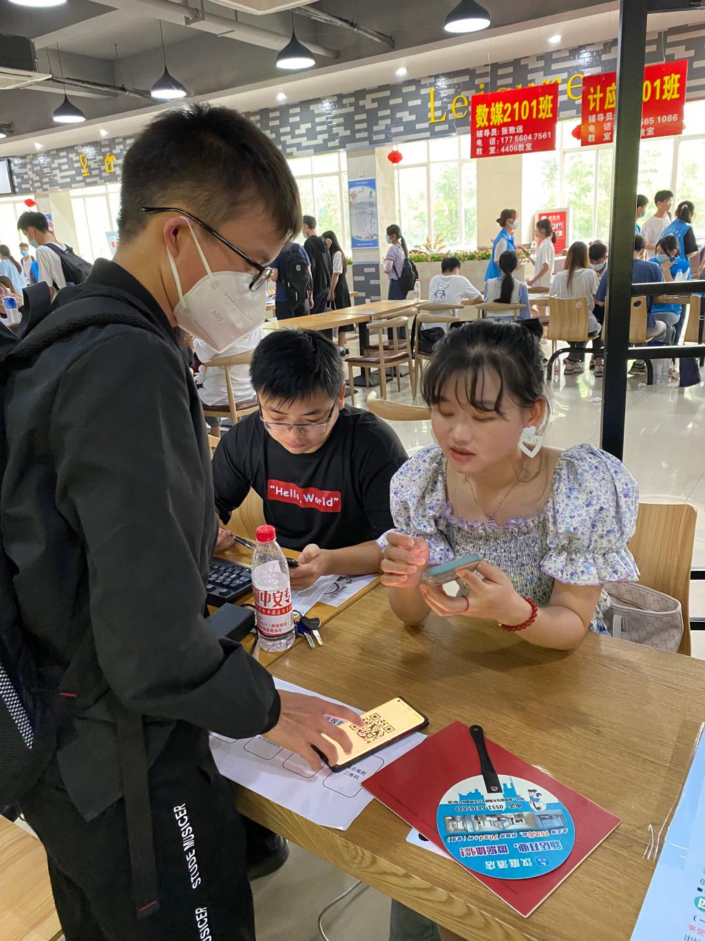 新生报到在学校食堂二楼进行,为了新生顺利报到,沿途都放置了报到指示牌,每个环节均有志愿者热情引导,悉心服务。