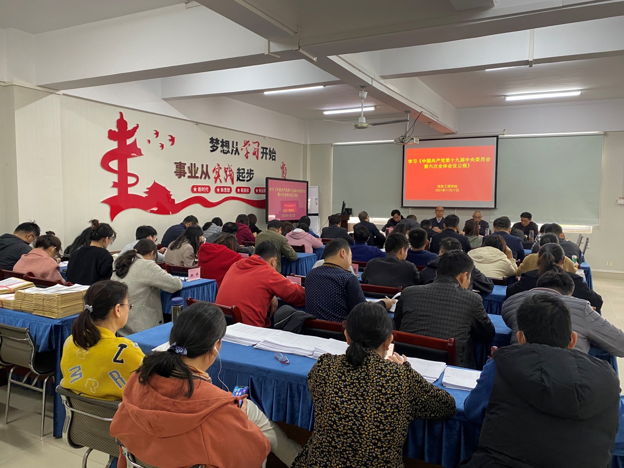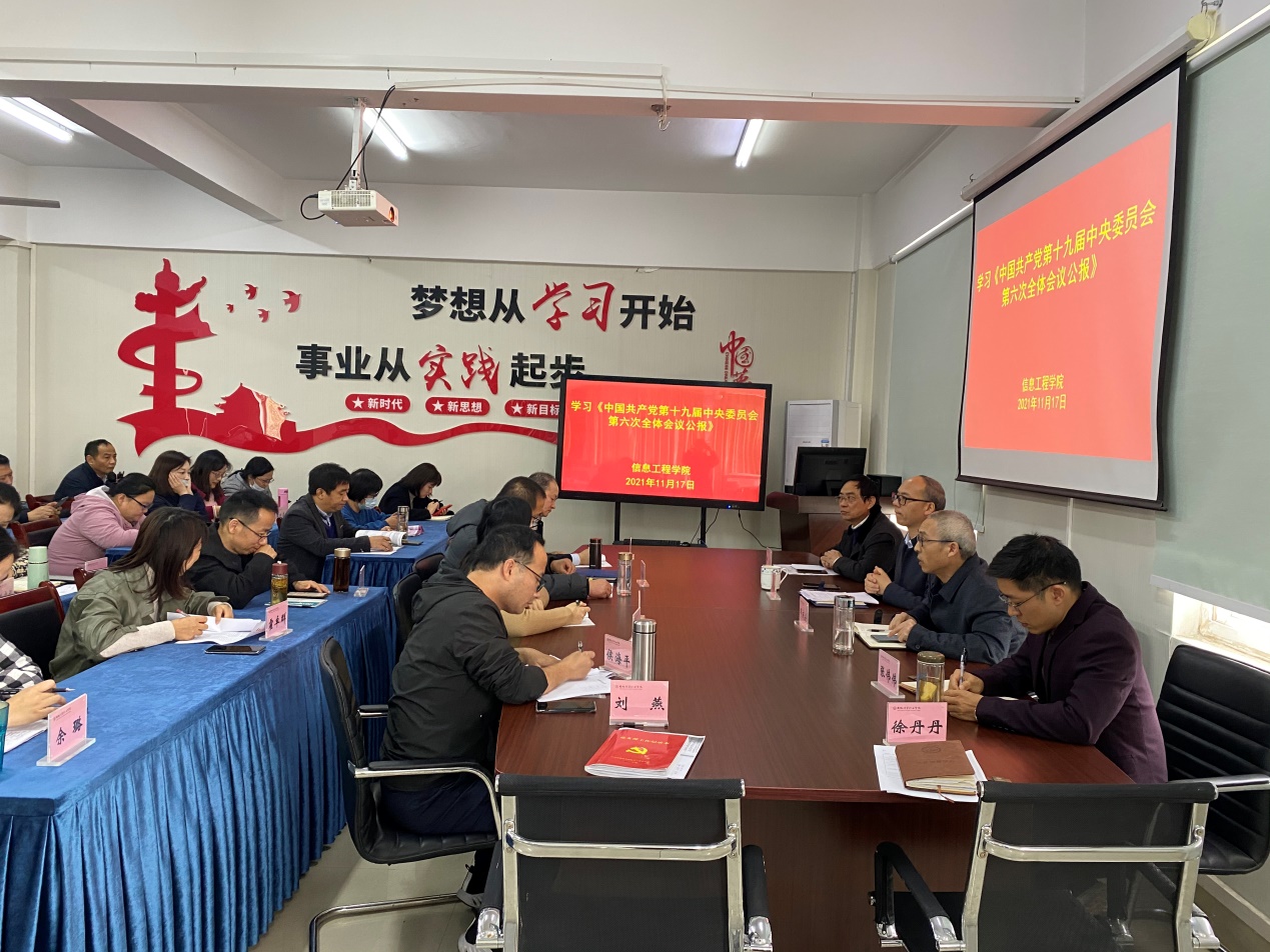 11月17日下午,信息工程学院党总支召开学习党的十九届六中全会精神专题会议,会议由党信息工程学院党总支书记邓庆安主持,全体教职工参加学习。
