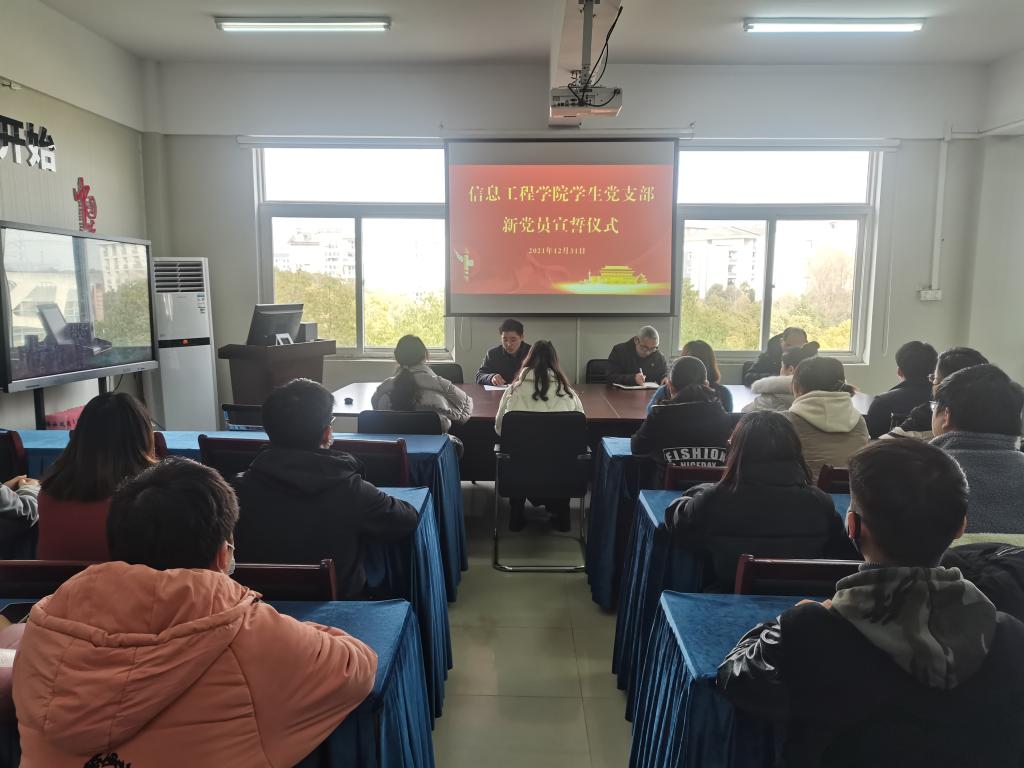 12月31日中午,信息工程学院学生党支部在313办公室召开新党员宣誓大会,大会由学生党支部组织委员姚德健老师主持,信息工程学院党总支书记邓庆安和学生党支部所有师生党员参会。