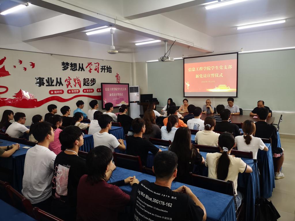 7月23日中午,信息工程学院学生党支部新党员入党宣誓仪式在综合楼313办公室隆重举行,学生党支部全体党员教师和学生新党员参加了宣誓仪式。