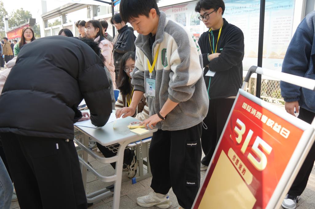 活动邀请同学们到印有“文明消费、绿色消费、健康消费、畅享消费”的横幅处签字并领取标签纸,写下自己在这个消费者权益日想说的话。现场非常火爆,同学们有序排队,纷纷写下自己心中的话贴在展示板上,“做好消费者指导工作,增强消费者维护权益能力”、“3.15国际消费者权益日,坚决维护消费者权益”、“理性消费,健康消费”、“学习相关知识,保障消费安全”......