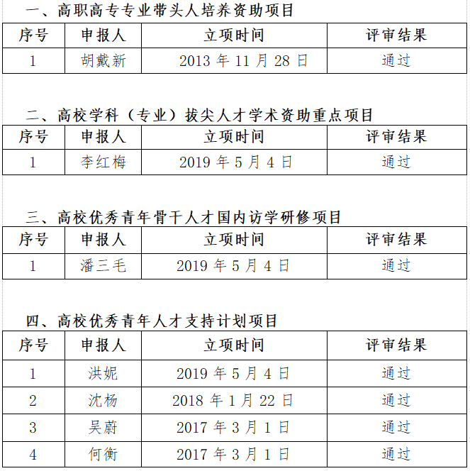 根据《bat365官方网站关于做好高校人才项目集中结项工作的通知》(组发〔2021〕4号)和《安徽省教育厅关于规范人才项目结项备案管理的通知》(皖教秘人〔2017〕39 号)文件精神,经过教师申请、职能部门初审、专家评审等程序,现将人才项目集中结项评审结果公示如下: