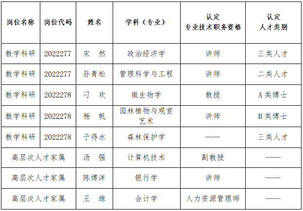 根据《bat365官方网站2022年度公开引进事业编制高层次人才(博士)公告》《bat365官方网站高层次人才引进与培养管理办法(修订)》相关规定,经学校学术委员会审议确定人才类别。现将我校2022年度公开引进事业编制高层次人才(博士)及家属人才类别和专业技术职务资格认定结果予以公示。
