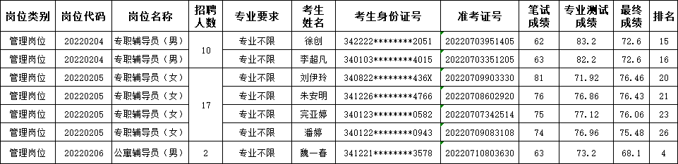 学院2022年度编外聘用人员公开招聘体检及政审考察阶段因考生放弃等原因,专职辅导员(男)(20220204)、专职辅导员(女)(20220205)、公寓辅导员(男)(20220206)等3个招聘岗位共缺额7人。