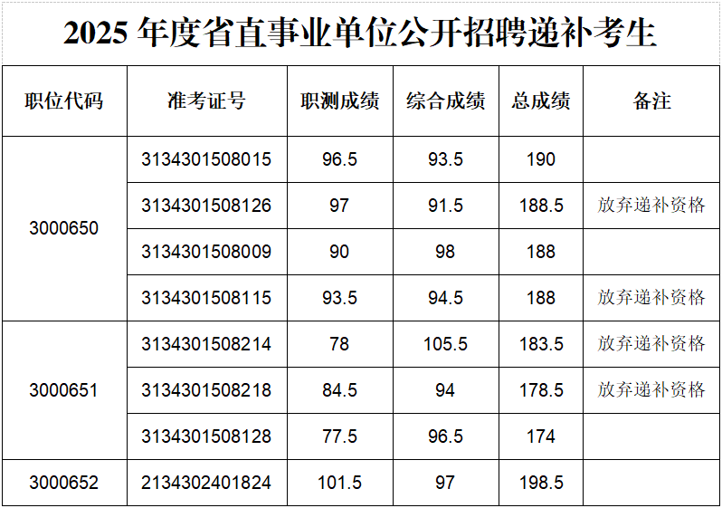 根据《bat365官方网站2025年度省直事业单位公开招聘工作人员进入资格复审人员的通知》,3000650、3000651和3000652岗位因考生资格复审不通过或放弃资格复审等原因出现人选缺额,现按照笔试成绩从高分到低分,依次等额递补(笔试成绩须达到最低控制合格分数线,并且每科成绩不低于60分),最后一名如有数名考生笔试成绩相同,一并进入资格复审环节。