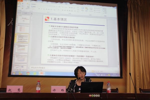 讲座中,人民银行合肥中心支行征信管理处同志解读了个人征信和信用知识,个人征信对学生未来择业、工作、生活的影响,介绍了如何维持良好的个人信用记录,通过案例提醒贷款学生充分认识信用违约及不良征信记录可能带来的严重后果。国家开发银行安徽省分行同志就国家开发银行生源地助学贷款最新政策、还款流程和常见问题等进行详细的介绍。安徽省农村信用社联合社同志讲解了安徽省农村合作金融机构生源地助学贷款基本政策和还款流程。