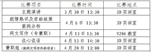 比赛内容:综合应用各项法律、法规和教育学、心理学、生涯规划、事务管理等辅导员工作技能,对现实工作中发生的具体案例进行分析、解决。