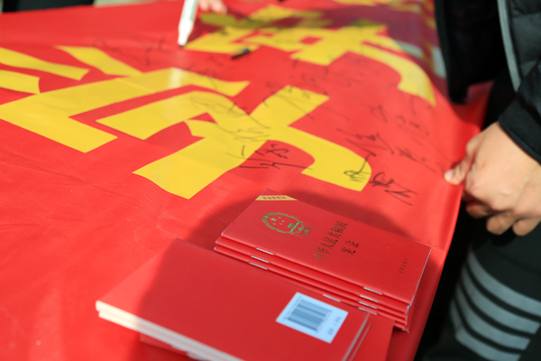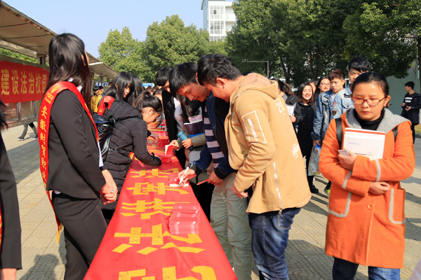 签名活动设在学院学生餐厅东门,院长助理、组织人事处处长吴晓光莅临活动现场。除了签名以外,保卫处还现场向师生发放了宪法宣传小读本。签名横幅现悬挂在学生餐厅东门的护栏上。