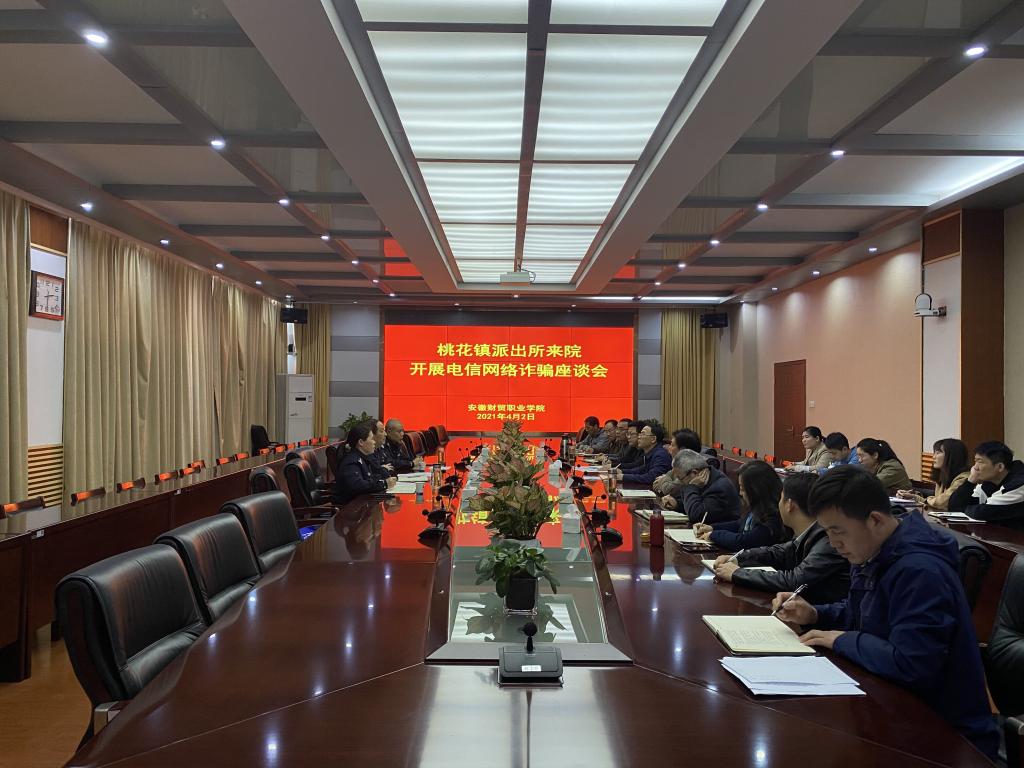 4月2日下午,辖区桃花派出所来院调研防范电信网络诈骗工作。学院领导何翔、胡戴新,桃花派出所教导员许彪、副所长童广立,学生处、总务处、二级学院党总支书记及有关人员参加会议。