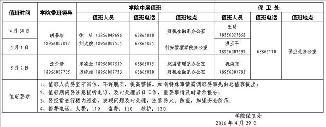 根据校历安排,学院2016年五一放假时间为4月30日至5月2日,假期学院值班安排如下: