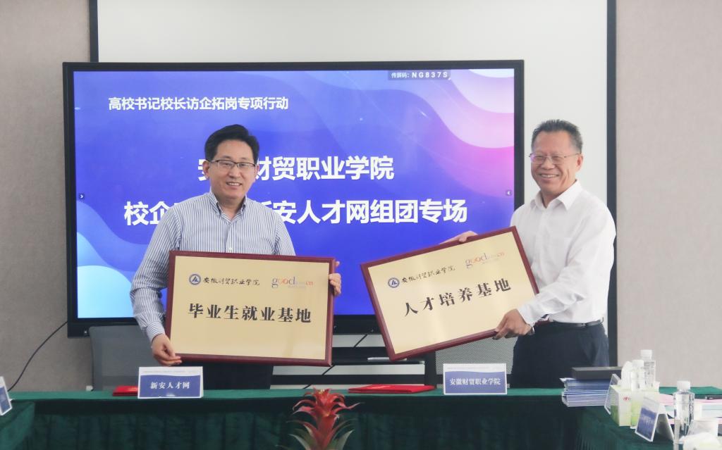 5月20日上午,学校党委副书记、校长刘银国前往新安人才网出席校企对接会,并为校企合作实习就业基地挂牌。新安人才网董事长兼总经理何德球出席活动。学校学生处、相关教学院部负责人及10家合作企业代表参会。