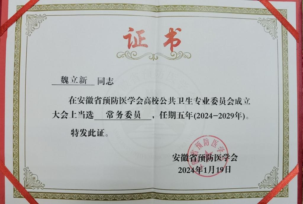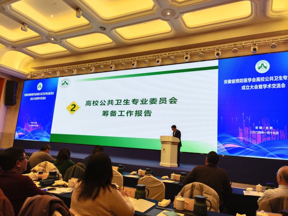 1月19日上午,由安徽省预防医学会承办的安徽省预防医学会高校公共卫生专业委员会成立大会暨学术交流会在合肥召开,我校总务处副处长、医务中心主任魏立新和赵天祥医生受邀参会。
